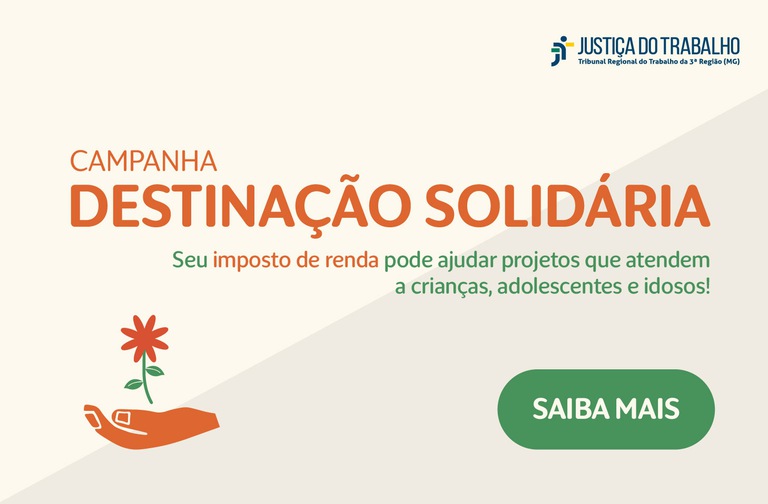 Saiba mais sobre esta iniciativaO Programa de Combate ao Trabalho Infantil e de Estímulo à Aprendizagem do TRT-MG apoia a campanha Destinação Solidária, promovida pela Receita Federal, e incentiva a destinação de recursos aos Fundos dos Direitos da Criança e do Adolescente.